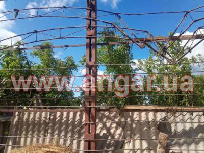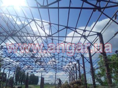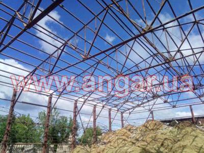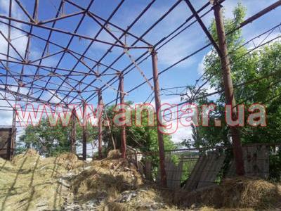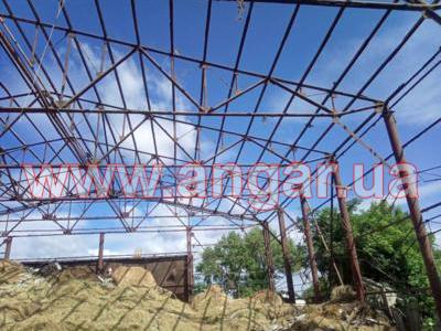 | Ангар прямостенного типа. Установленный каркас. Несущие колонны из спаренного на расстоянии швеллера сечением 160мм (18шт.) и трубы сечением 219мм (14шт.). Всего 32 шт. Шаг колонн 3м. Высота колонны 6м. Колонны забетонированы. Торцевые колонны из спаренного на расстоянии швеллера сечением 160мм (2шт.) и трубы сечением 219мм (4шт). Ферма двускатная, верхний, нижний пояс и раскосы из спаренной трубы сечением 50мм. Высота фермы 2,5м. Шаг ферм 3м. Крепление ферм к колоннам болтовое. Всего 16 ферм. Вес конструкции около 35т. |