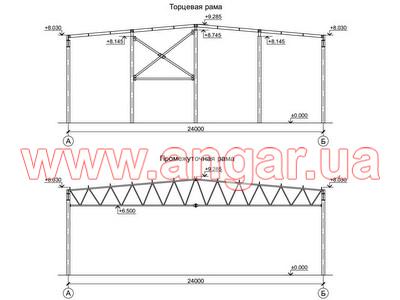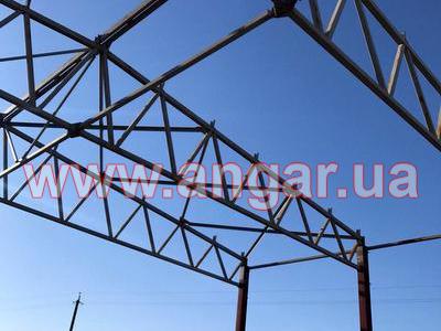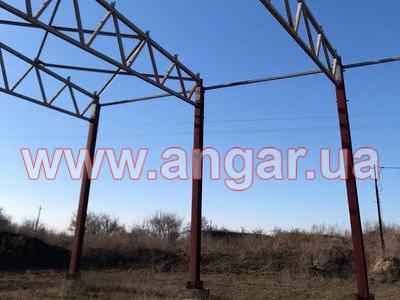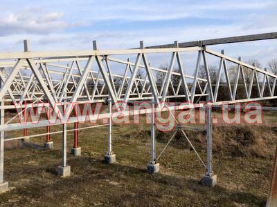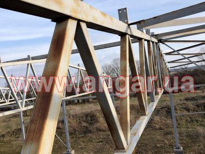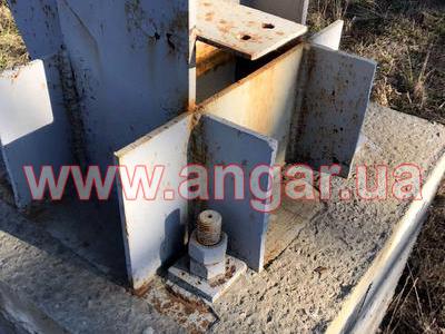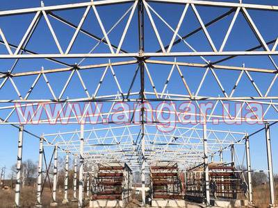 | Ангар прямостенного типа. Установленный каркас. Несущие колонны из двутавровой балки сечением 330х260х12мм. Всего 36 шт. Фахверковые колонны из двутавровой балки сечением 240х240х10мм. Всего 6 шт. Шаг колонн 6м. Высота колонн 6,80м. Крепление к фундаментам на анкерных болтах. Ферма состоит из двух полуферм. Верхний пояс из профильной трубы сечением 150х150мм, нижний пояс из профильной трубы сечением 150х120мм, раскосы из профильной трубы сечением 100х100мм. Высота фермы в центре 2,20м, высота по краям 1,20м. Всего 16 ферм. В комплекте металлическая связь на всю длину ангара из спаренного швеллера сечением 200мм и профильной трубы сечением 100х100мм. Ветровые связи из уголка сечением 90мм, всего 6шт. Торцевые рамы (колонны и фермы) из двутавровой балки сечением 240мм. Общий вес 85т. |