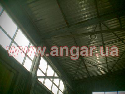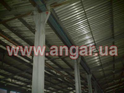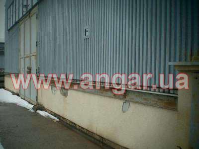 Ангар прямостенного типа. Установленный в полной комплектации. Двухпролетный. Несущие колонны из гнутого профиля коробчатого вида сечением 400х160мм. Высота колонн 6м. Шаг колонн 6м. Всего несущих колонн - 33шт. Торцевые колонны из двух швеллеров сечением 200мм сваренных в коробку. Всего торцевых колонн - 8шт. Крепление колонн к фундаментам на анкерных болтах. Стропильная балка из гнутого профиля коробчатого вида сечением 400х160мм. Затяжка для балок из двух равнополочных уголков сечением 100мм. Крепление балок к колоннам на болтовом соединении. Кровельные прогоны из швеллера сечением 160мм. Шаг кровельных прогонов 1,5м. Всего кровельных прогонов - 24 ряда (1440м.п). В наличие четверо торцевых распашных ворот и восемь фасадных распашных ворот размером 4х4м. По всему периметру здания предусмотрено установка окон. Обшит оцинкованным профлистом толщиной.