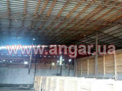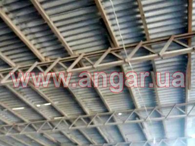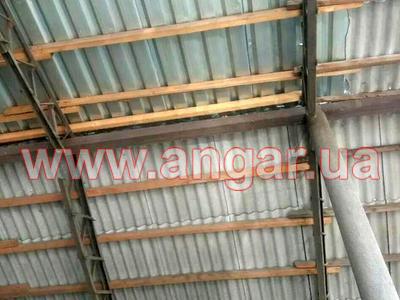 | Ангар прямостенного типа. Каркас навеса. Установлен. Двускатный. 4-х пролетный. Колонны из трубы сечением 219мм. Всего 65шт. Шаг колонн 6м. Высота колонн: 6м, 5м, 4м. По колоннам крепится швеллер сечением 160мм. Колонны забетонированы в фундамент. Фермы с параллельными поясами. Верхний и нижний пояс из швеллера сечением 80мм, раскосы из арматуры сечением 18мм. Всего 100шт. Шаг ферм 3м. |