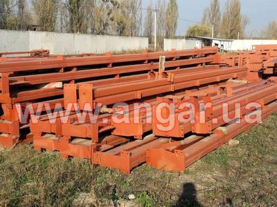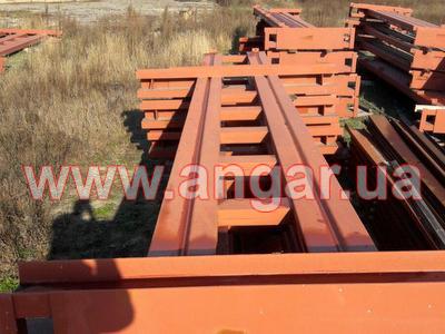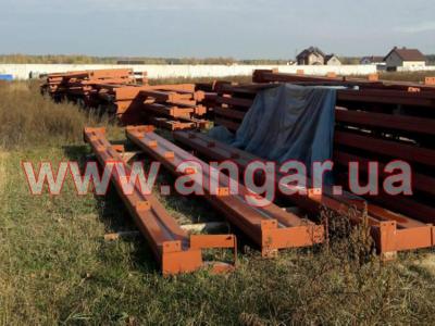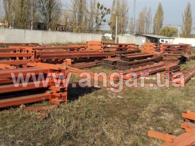 |  Ангар прямостенного типа. Лежалый. Двухпролетный. Внешние несущие колонны из замкнутого профиля коробчатого сечения 640х150мм. Центральные несущие колонны из двух коробчатых профилей сечением 320х150мм сваренных на расстояние. Шаг колонн 6м. Всего внешних несущих колонн - 26шт, центральных несущих колонн - 13шт. Всего торцевых колонн - 8шт. Крепление колонн к фундаментам на анкерных болтах. Стропильная балка из замкнутого профиля коробчатого профиля сечением 480х150. Затяжка кровельных балок из спаренного равнополочного уголка сечением 90х90мм. Всего балок - 42шт.(должно быть 44шт.). Торцевые стропильные балки сечением 320х150мм. Затяжки на торцевых стропильных балках не предусмотрены. Крепление балок к колоннам на болтовом соединении. Кровельные прогоны из гнутого профиля швеллера сечением 240мм. Всего кровельных прогонов 28 рядов. Всего стеновых прогонов 6 рядов. Всего вертикальных связей - 4шт. В комплекте анкерные болты с шайбой и гайкой - 94 комплекта (из них для несущих колонн - 78шт, для торцевых колонн 16 шт.). Также в наличии метизная группа для сборки каркаса (порядка 1,5т). В комплекте 5 ворот размером 3,60*4,00м. Конструкция складирована и готова к погрузке. |