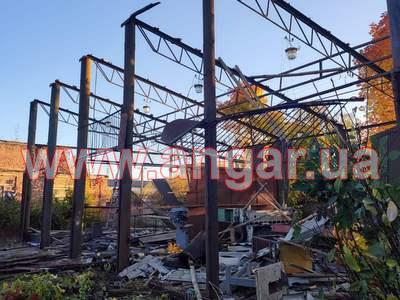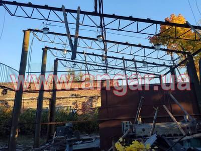 | Ангар прямостінного типу. Односкатний навіс. Демонтований каркас. Колони з труб різних перерізів (діаметром 273мм та 325мм). Висота бокових низьких колон 4,5м, Висота бокових високих колон 6,5м.Крок колон 4м. Кріплення до фундаментів на закладних. Всього 22 колони. Ферма з паралельними полками. Довжина ферми 9,71м. Всього 11 ферм. Верхній пояс з двох спарених кутиків перерізом 90мм. Нижній пояс та розкоси з трута діаметром 30мм. Перемички з прута перерізом 32мм. Кріплення до ферм зварне. Всього 11 ферм. Вага 1 ферми 400кг. Ангар демонтований, складований і готовий до відвантаження. |
