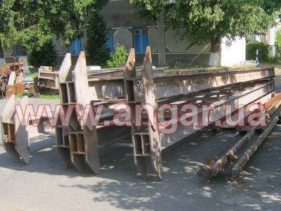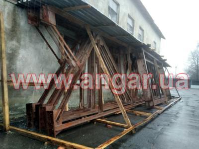 Ангар прямостенного типа. Демонтированный каркас. Колонны из четырех швеллеров сечением 240мм: по два швеллера сваренные в виде двутавра, потом эти двутавры разварены на расстоянии швеллером сечением 120мм. Всего колонн 16шт. Шаг колонн 6м. Крепление к фундаментам на анкерных болтах. На колонны устанавливаются надколонники из двутавра сечением 440мм. Всего надколонников 16шт. Крепление надколонников к колоннам на болтовом соединении. Ферма цельносварная. Верхний и нижний пояса фермы из спаренного равнополочного уголка 110х110мм. Раскосы фермы из спаренных равнополочных уголков 90х90мм и 75х75мм. Шаг ферм 6м. Всего ферм 8шт. Крепление ферм с подколонниками на болтовом соединении. Подколонники между собой вдоль ангара соединены двутавром сечением 300мм (по низу подколонников) и швеллером сечением 180мм (по верху подколонников). Кровельные прогоны из швеллерра сечением 160мм. Всего кровельных прогонов 10 рядов (420м.п). Вес около 70т.