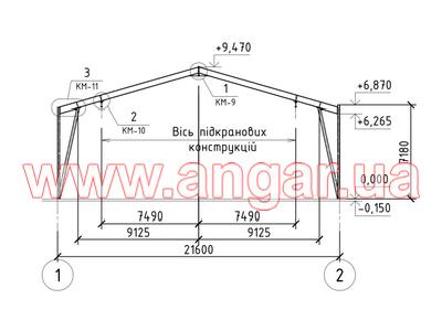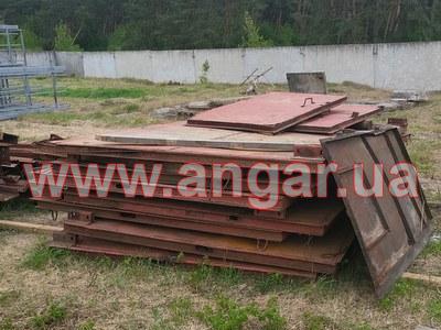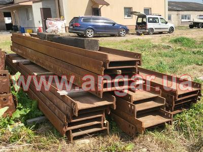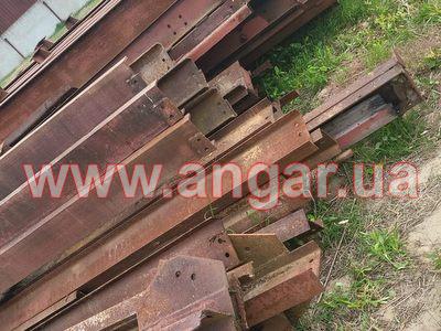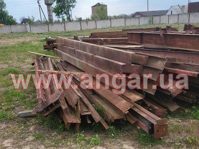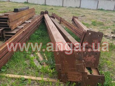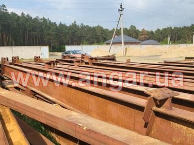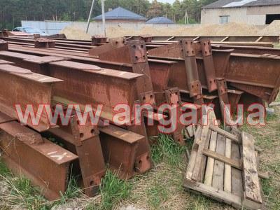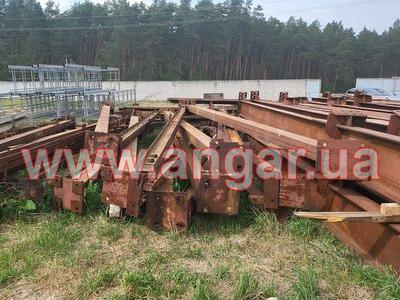 Ангар прямостінного типу. Демонтований каркас. Металеві колони складного перерізу. Пряма частина з двох швелерів перерізом 200м зварених у вигляді двотавру ][. Нахилена частина з двох швлерів перерізом 160мм зварених в коробку. Всього 22 колони. Крок колон 6м. Кріплення до фундаментів на анкерах. Торцеві колони з двотавра перерізом 200мм Всього 4 торцеві колони. Покрівельна кроквяна балка з двотавру перерізом 450мм. Всього 22 покрівельні кроквяні балки. Підкранова балка з двотавру перерізом 450мм. Всього 120м.п. Стінові прогони з профільної труби перерізом 100мм, покрівельні прогони зі швелеру перерізом 180мм. В комплекті 4 розпашних воріт. Конструкції демонтовані складовані і готові до завантаження.