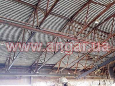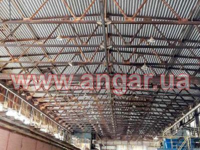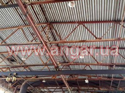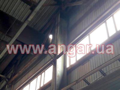 Ангар прямостенного типа. Модульное здание типовой проект Житомир. Установленный каркас. Несущие колонны из двутавровой балки сечением 490мм. Шаг несущих колонн 12м. Всего несущих колонн - 30шт. Фахверковые и торцевые колонны из двутавровой балки сечением 300мм. Всего фахверковых колонн - 28шт, торцевых колонн - 6шт. Высота колонн 9м. Крепление колонн к фундаментам на анкерах. Ферма состоит из 2-х полуферм. Верхний пояс из двутавровой балки сечением 200мм. Нижний пояс из уголка сечением 90мм. Раскосы из уголка сечением 45мм. Шаг ферм 4м. Всего 43 фермы (86 полуферм). На фермы крепится подкрановый путь из двутавровой балки сечением 200мм. Всего 504м.п. (3 ряда).