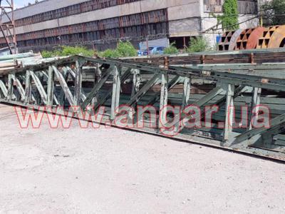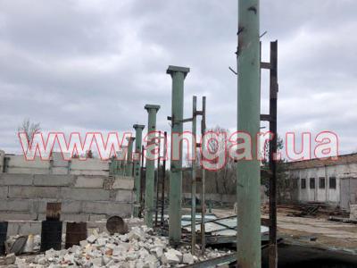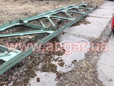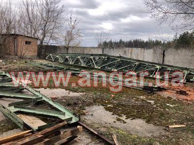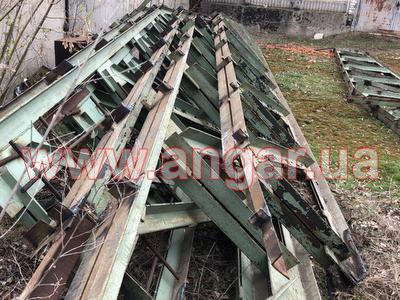 | Ангар прямостенного типа. Демонтированный каркас. Колонны из трубы сечением 325мм, толщина металла 8мм. Всего 20 шт. Шаг колонн 5,5м. Высота колонны 5,90. Фермы цельносварные. Верхний, нижний пояс и раскосы из спаренного уголка сечением 80мм. Крепление к колоннам сварное. Высота фермы: по краям 0,95м, по центру 1,50м. Всего 10 шт. Вес конструкции 18т. |