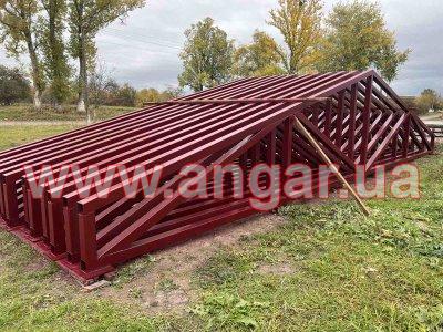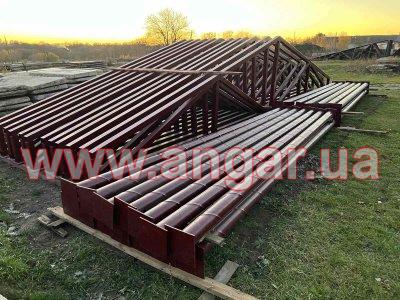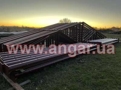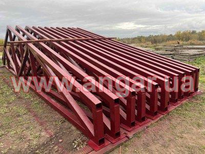 | Ангар прямостінного типу. Лежалий каркас. Колони виготовлені зі спіралешовної труби перерізом 159мм, Товщина стінки 5мм. Висота колони 6м. Крок колон 6м. Всього 26 колон (24 несучі +2 торцеві). Ферма виготовлена з профільної труби перерізом 100х100х3. Всього 12 ферм. Крок ферм 6м. Кріплення до колон на зварці через закладні. Ангар прогрутований, складований і готовий до відвантаження. |