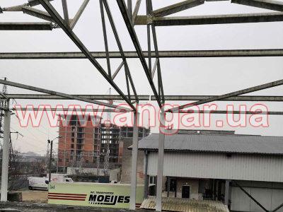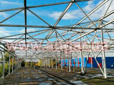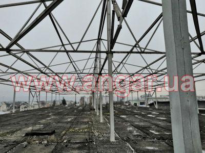 Ангар прямостенного типа. Установлен. Каркас. Под складское (склад) или производственное (цех) помещение. Двухпролетный. Колонны из двух швеллеров сечением 200мм сваренных в коробку. Шаг колонн 6м. Всего 48шт. Фермы из двух полуферм по 12м. Высота фермы 3,05м. Изготовлены из профильной трубы 100х100мм и 80х80мм. Всего 16 ферм. Крепление к колоннам на болтах. Прогоны из двутавра сечением 140мм (примерно 840 м.п.). Ориентировочный вес 45-50т.