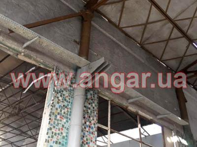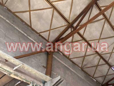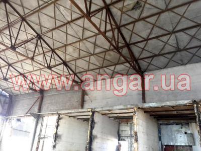 | Ангар прямостенного типа. Установленный каркас. Несущие колонны из трубы сечением 273мм, толщина стенки 10мм. Всего 18шт. Шаг колонн 6м. Высота колонны 7,5м. Колонны забетонированы. Торцевые колонны из трубы сечением 219мм, толщина металла 10мм. Всего 4 шт. Фермы цельносварные. Верхний пояс из спаренного уголка сечением 90мм, нижний пояс из спаренного уголка сечением 75мм. Раскосы из спаренного уголка сечением 50, 63мм. Высота фермы 2,75м. Шаг ферм 6м. Всего 8шт. Крепление ферм к колоннам сварное. Кровельные прогоны из швеллера сечением 140мм. Всего 672 м.п. (14 рядов). |