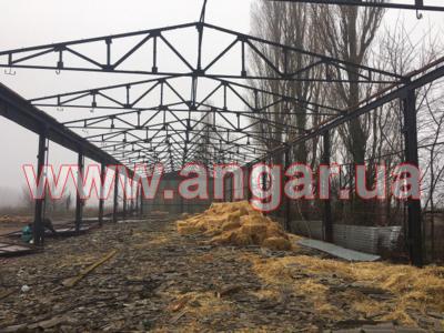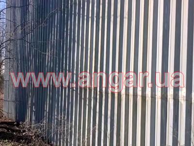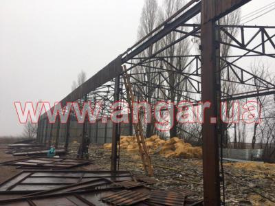 | Ангар прямостенного типа. Установлен, разукомплектован. Колонны из швеллера сечением 400мм (колонна расшита уголком для ребра жесткости). Всего 26 колонн. Шаг колонн 6м. Высота колонны 5,30м. Крепление к фундаментам - забетонированы. По колоннам установлена подстропильная балка из двутавра сечением 220мм, на которую крепятся фермы. Крепление ферм к подстропильной балке - сварное. Фермы цельносварные. Верхний пояс из спаренного швеллера сечением 80мм, нижний пояс из швеллера сечением 100мм, раскосы из швеллера сечением 80мм. Высота фермы 1,80м. Всего 19 ферм. Шаг ферм 4м.Стены ангара обшиты оцинкованным листом. В комплекте 10 распашных ворот размером 5х5м, и одни распашные ворота размером 3х3м. Всего 11 ворот. На крыше шифер. Вес конструкции около 45т. |