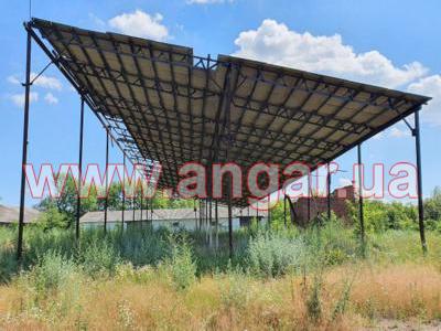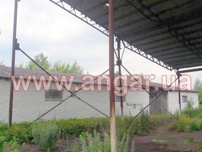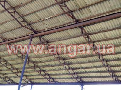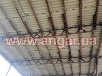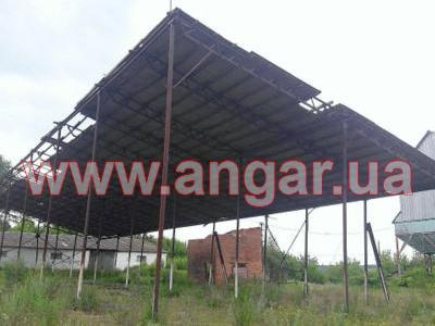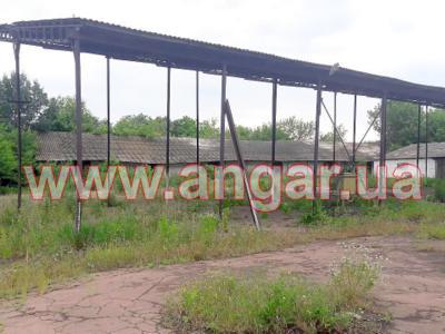 | Ангар прямостенного типа. Каркас навеса. Установлен. Односкатный. Двухпролётный. Колонны из буровой трубы сечением 100мм. Толщина металла 9мм. Высота колонн 8м, 7м, 6м. Шаг колонн 6м (одна колонна стоит с шагом 3м). Всего 25 колонн. Крепление колонн к фундаменту сварное. По колоннам крепится швеллер сечением 160мм. Всего 3 ряда (126м.п). Фермы с параллельными поясами. Верхний и нижний пояс из уголка сечением 63мм, раскосы из уголка сечением 35мм. Высота фермы 0,60м. Шаг ферм 3м. Всего 30шт. Крепление ферм к подстропильной балке сварное. |