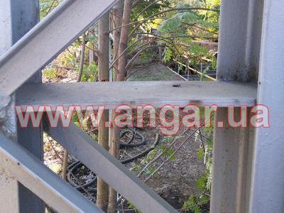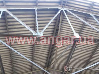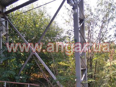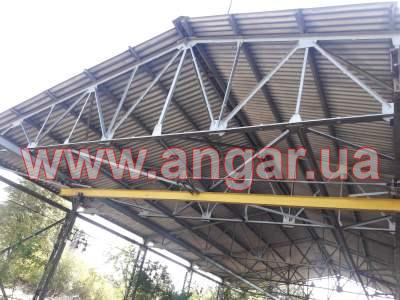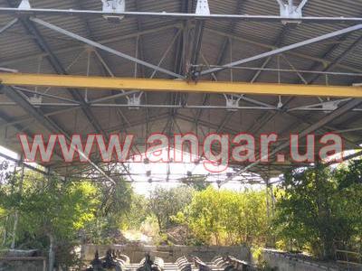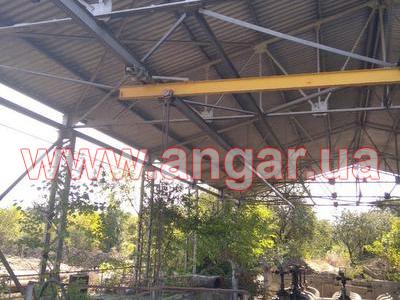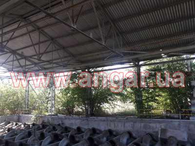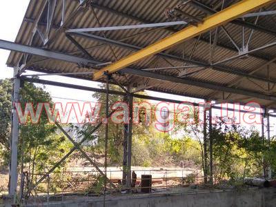 Ангар прямостенного типа. Установленный каркас. Складское или производственное помещение. Колонны из спаренного швеллера сечением 200мм, разваренного 50 уголком. Шаг колонн 6м. Всего 12 колонн. Фермы из спаренного уголка сечением 75мм. Шаг ферм 6м. Крепление к колоннам болтовое. Всего 6 ферм.. Прогоны из швеллера сечением 160мм. Всего 14 рядов. По колоннам сверху установлена распорка из спаренного швеллера сечением 80мм. В наличии подвесная таль грузоподъемностью 1т. Подкрановый путь двутавровая балка сечением 300мм.