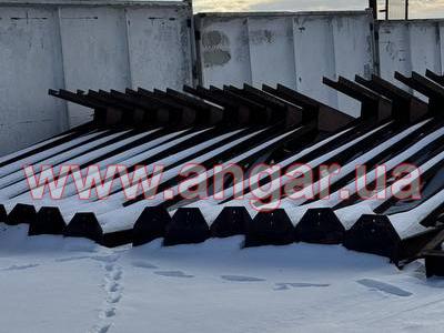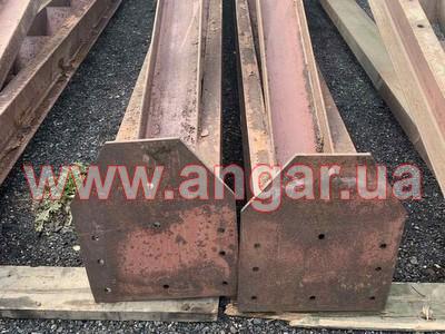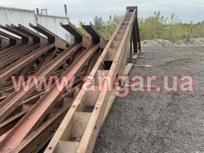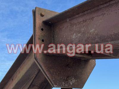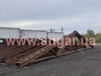 | Ангар прямостінного типу. Демонтований каркас. Колони зі спареного швелеру перерізом 200мм звареного в коробку. Крок колон 6м. Кріплення до фундаментів на анкерах. Довжина колони 5,5м. Всього 22 колони. Ферма металева розмірна. Верхній пояс з двох швелерів перерізом 180мм зварених на відстані, нижній пояс одинарний швелер перерізом 180мм. Висота ферми 2,4м. Всього 11 ферм. (22 напівферми). Кріплення до колони на болтах. Конструкція демонтована, складована і готова до відвантаження. |