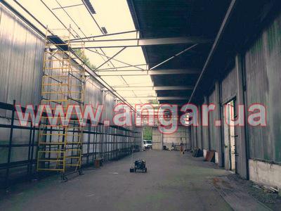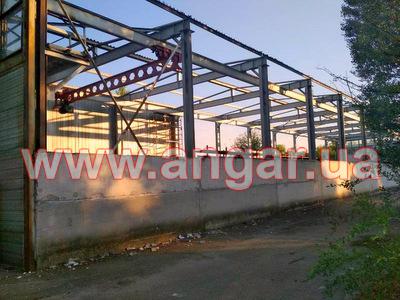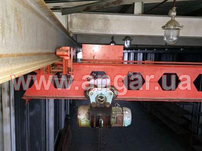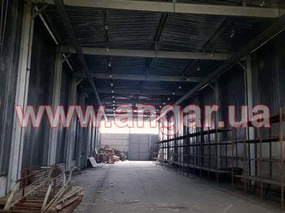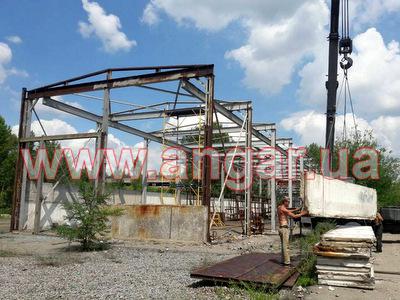 | Ангар прямостенного типа. Демонтированный каркас. Подойдет под складское производственное помещение. Несущие колонны из 30 двутавра. Шаг колонн 6м. Всего 22 несущих колонны. Кровельная балка из 45 двутавра. L=12м. На балке организована конструкция, создающая два ската, из швеллера сечением 160мм. По кровле 6 рядов прогонов из швеллера сечением 160мм. В комплекте подвесная кран балка грузоподъемностью 5т. |