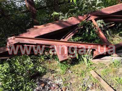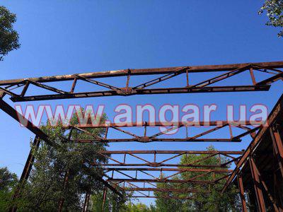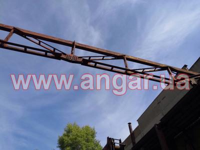Ангар прямостенного типа. Установленный каркас. Колонны из двутавровой балки 40Ш2.Всего 18 колонн. Крепление к фундаментам на 4 анкерных болтах Шаг колонн 6м. Всего 18 несущих колонн. Фермы шириной 18м состоят из двух полуферм по 9м. Крепление полуферм между собой на болтовом соединении. Верхний пояс из двух швеллеров сечением 240мм сваренных в коробку. Нижний пояс из двух равнополочных уголков сечением 125х10мм. Раскосы из уголков сечением 50мм и 70мм. Крепление к колоннам на болтовом соединении. Всего 9 ферм (18 полуферм) На высоте 6м установлены две кран балки грузоподъемностью 5т. (тельфера нет). Подкрановый путь из двутавровой балки 36м и рельса Р24. Прогоны по кровле 3 ряда из 16 швеллера сваренного в коробку.