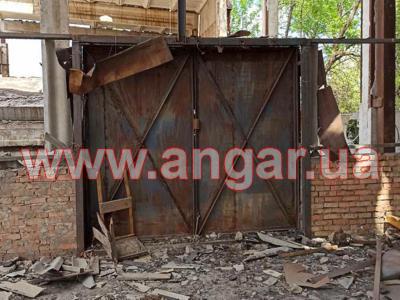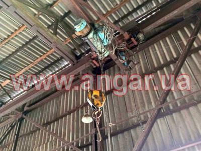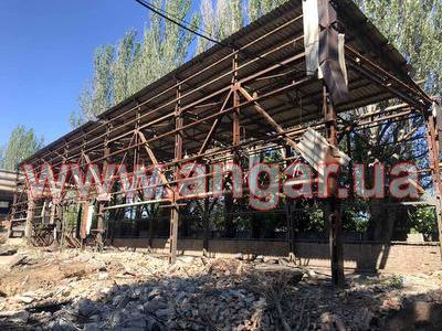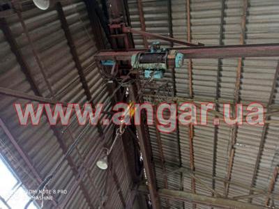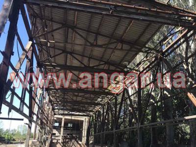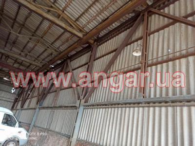 |  Ангар прямостенного типа. Установленный каркас. Несущие колонны из двух спаренных на расстоянии швеллеров сечением 200х250мм. Всего 12 шт. Шаг колонн 8м. Высота колонны 6,90м. Крепление к фундаментам на анкерах. Между несущими колоннами вдоль ангара на высоте 2м установлен швеллер сечением 200мм, на который устанавливаются промежуточные полуколонны из спаренного на расстоянии швеллера сечением 120мм. Всего 10 шт. Между несущими колонными поперек ангара установлена балка из двух спаренных на расстоянии швеллеров сечением 200мм. К этой балке крепится подкрановый путь из двутавра сечением 240мм. Кран балка грузоподъёмностью 3,2т ( тельфера нету). Фермы односкатные, верхний, нижний пояс и раскосы из уголка сечением 90мм. Крепление ферм к колоннам сварное. Всего 11 ферм. Под каждой второй Связи по фасаду ангара из швеллера сечением 200мм. Стеновые прогоны из швеллера сечением 120мм. Всего 481 м.п (5 рядов). Кровельные прогоны из швеллера сечением 120мм. Всего 240 м.п. (6 рядов). В комплекте двое распашных ворот размером 3х3м. Вес конструкции около 15т. |
