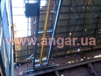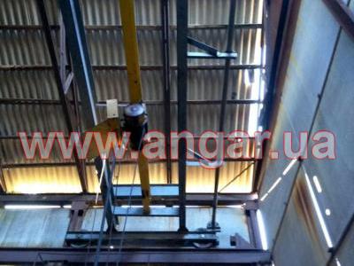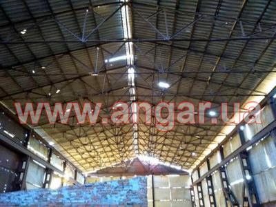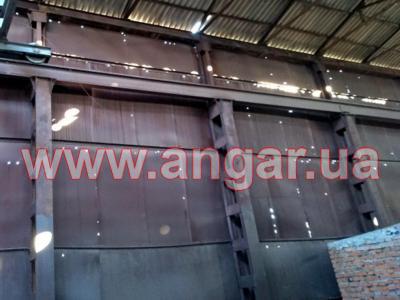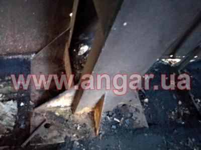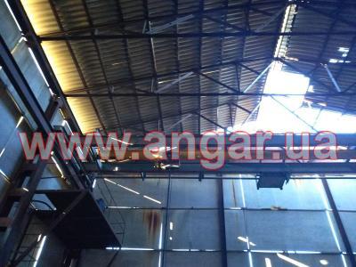 | Ангар прямостенного типа. Установленный каркас. Колонна сложного сечения, из двух швеллеров №27П, сваренных на расстоянии пластинами из листового металла. Всего 18 колонн. Шаг колонн 5м. Высота колонны 10м. Крепление к фундаментам на анкерах. Торцевых колонн - 4шт. Консоли под кран-балку установлены на высоте 8,30м. Подкрановый путь из двутавровой балки №27С с квадратом 40. Кран-балка грузоподъемностью 5т. Фермы цельносварные. Верхний и нижний пояс из спаренного уголка сечением 55х5, раскосы из уголка. Крепление к колоннам сварное. Высота фермы 2м. Шаг ферм 2,5м. Всего 17шт. Вес конструкции около 42т. |