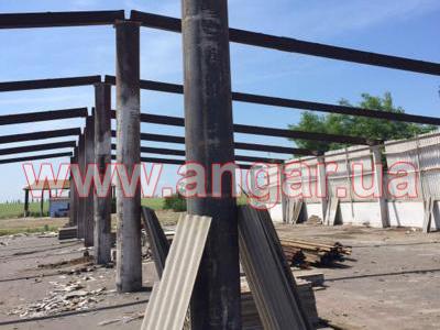 | Ангар прямостенного типа. Демонтированный каркас. Двускатный. Двухпролетный. Центральный ряд колонн из трубы сечением 530мм (толщина стенки 8мм), колонны по краям ангара из двутавровой балки сечением 300мм. Всего 63 колонны. Шаг колонн 6м. Высота центрального ряда колонн 6,00м, высота колонн по краям ангара 4,50м. Крепление к фундаментам на закладных. Кровельные балки из двутавра сечением 300мм. Крепление к колоннам сварное. Всего 42шт. Кровельные прогоны из уголка сечением 75мм. Всего 2640м.п. Вес около 65т. |