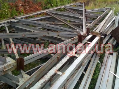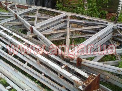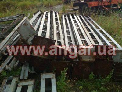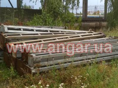 | Ангар прямостенного типа. Демонтированный каркас. Колонна сложного сечения из 4-х уголков 75мм сваренных на расстоянии пластинами из листового металла. Всего 14 колонн. Шаг колонн 4м. Высота колонны 4м. Крепление к фундаментам на анкерах. Фермы цельносварные. Верхний, нижний пояс и раскосы из спаренного уголка сечением 75мм. Крепление к колоннам сварное. Высота фермы 1,60м. Ангар складирован и готов к погрузке. |